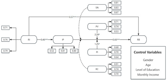 Figure 2. From the hypothesis verification of the direct path, it can be observed that the standardized path coefficient of residents’ e-waste online recycling intention to actual behavior is 0.566 (