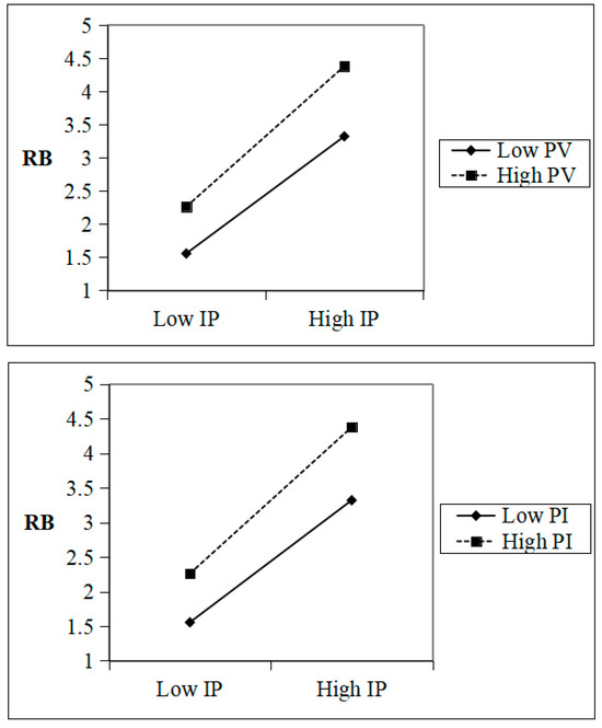 The study used the binary logistic regression method to test the moderating effect of the model hierarchically. First, all variables were centralized. Second, the centralized IP was multiplied by the centralized four moderator variables, respectively, to obtain four interaction terms. Finally, regression analysis was carried out, and the control variables, centralized variables, and interaction items were incorporated into the model layer by layer for analysis. The results of the moderating effect were obtained, as shown in the simple slope analysis diagram in