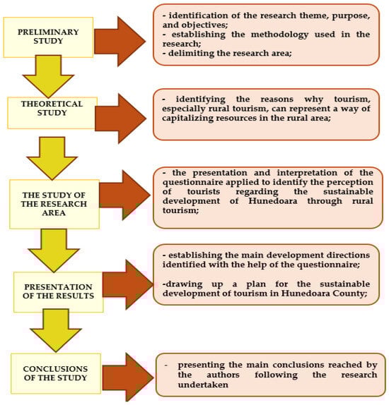 The main objective of this research was to create a plan for the sustainable development of rural tourism in Hunedoara County, starting from a need to diversify the economy of the rural area. The final purpose of this plan is to inform local decision-makers and potential tourists, taking into account a study based on a questionnaire. The work aimed to strengthen and support the proposed main objective and had the following working hypotheses and steps (Figure 2):