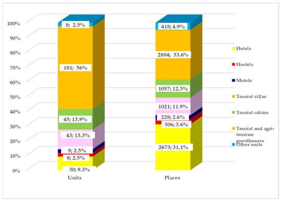 The distribution of the number of accommodation places is different from the one concerning units; thus, tourist and agritourist guesthouses hold only 33.6% of the existing accommodation capacity, followed by hotels (31.1%), tourist cabins (12.3%), tourist villas (11.9%), hostels (3, 6%), motels (2.6%), and other units (4.9%) (see Figure 5).