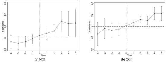 The benchmark regressions in Table 5 and Table 6 analyze the impact of ESG rating events on the quantity and quality of GTI. The findings indicate that the estimated coefficients of the primary explanatory variable ESG are consistently and significantly positive, irrespective of the inclusion of control variables. This implies that ESG grading events have the potential to greatly improve both the amount and the quality of GTI in companies. H1 has been confirmed. Meanwhile, the estimated coefficient of is also significantly positive, which indicates that the higher the ESG rating score, the more enterprises tend to carry out GTI. The ESG rating event plays a crucial role in encouraging firms to engage in GTI. Firms with a strong ESG rating demonstrate their effective management and long-term operational stability, hence fostering positive advancements in their GTI.