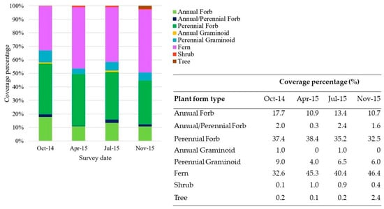 | Cluster Number Shown in Figure 9 | Traits of Cluster | No. of Species | Range of Average Coverage % (Std Dev at Species Level) | Typical Pattern of Coverage % over the Year (14 October, 15 April, 15 July, 15 November) |