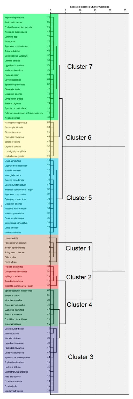 | Aggressive and fast spreading forb, ferns, graminoids with tubers | Remove all or most of them | Upset balance of species diversity | Nephrolepis auriculata, Polygonum chinense, Imperata cylindrica var. major |