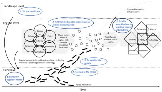 6. Tilt the landscape: Interventions deal with broad framework conditions that exist in the landscape. The recent sustainability transition literature investigates the impacts of changes on landscape pressures, such as international climate change agreements [39,40]. Examples of measures to tilt the landscape include the banning of chlorofluorocarbons (CFCs) via regulations created by the international community, and the Paris Agreement. Underlying aim: to alter the broader framework conditions enabling change in the directionality of locally bounded socio-technical systems.
