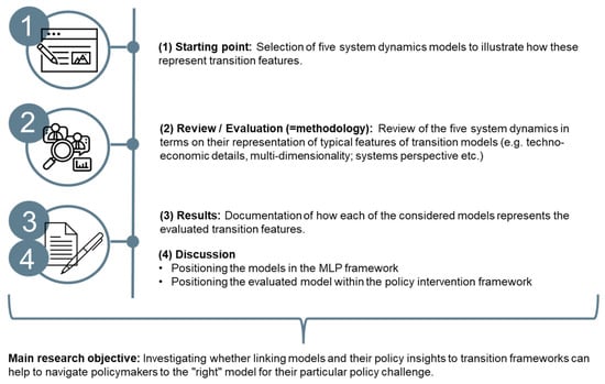 There are a number of already existing studies demonstrating that SD models are suitable to simulating complex energy transitions [14,15,16,17,18,19,20]. Moreover, [15,21,22] focused on investigating the suitability of system dynamics modelling for the operationalisation of sustainability transition theories. Further, some SD models have explicitly been defined as transition models, including the BLUE model [23]; the SD models presented in [24,25], the model presented in [12,26]. Finally, reviews of existing sustainability transition models can be found in [3,27,28]. However, the novelty of our paper lies in the integration of (reviewed SD) models and their policy recommendations into coherent sustainability transition frameworks, namely the MLP framework [6,16] (and the policy intervention framework [17]). We are not aware of any other study that explored this endeavour.