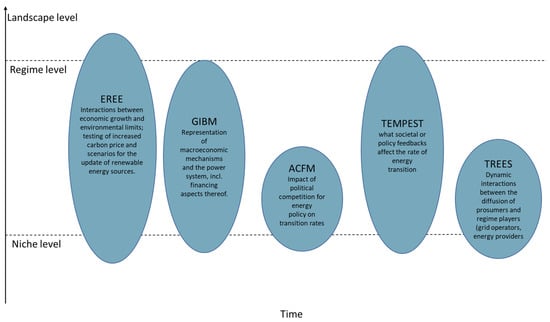 4. Path dependency, lock-in, inertia and self-reinforcement of change: System dynamics is a modelling tool particularly well suited to capture path dependency, lock-in, inertia and self-reinforcement of change (see Section 2.2). The following examples indicate how the evaluated models capture this feature: ERRE and the GIBM include various feedback loops within the economy (e.g., Keynesian multipliers). ERRE further includes important feedback loops between the economy and the natural resource limits (e.g., hot house effect on climate, resource depletion and land availability). The GIBM also represents path dependency in the power supply sectors both through the energy firms’ preference for certain technologies, and because installing energy infrastructure leads to learning effects of the installed technology, driving a reduction in price. The ACFM examines both path-dependent and lock-in dynamics through fossil fuel coalition resistance to renewables moving out of the niche, intensifying lobbying efforts as the market share of renewables increases. Self-reinforcement is included by intensifying green advocacy coalition efforts to manipulate policy making as climate change impacts rise. TEMPEST includes a combination of reinforcing loops driving mitigation progress (learning by doing), and balancing loops limiting progress (societal pushback against strong policy pushes). Both inertia and self-reinforcement of change are represented, and the combination of all feedback loops determines the rate of mitigation. TREES focuses on different constellations of electricity self-consumption concepts. Consumer decisions are modelled on their individual decision context explicitly representing individual path dependency. The self-reinforcing feedback loop of the grid cost-recovery effect on prosumer diffusion is a central part of the model. Several further feedback loops govern the diffusion of the prosumer concepts: peer effects, investor roof match probability and the scarcity effect. For flexibility aggregators, the lock-in effect of being “too small to bid” (Kubli and Canzi, 2021 [34]) is captured, which turns into a self-reinforcing process once it has been overcome. Also, TREES considers additional feedback loops that evolve around the flexibility premium and the impact of flexibility provision, both dependent on the bidding success in balancing power markets (see Table A4).
