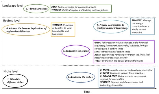 Sustainability transition scholars have developed several conceptual frameworks to study STT, including the multi-level perspective (MLP) [6], the technological innovation system approach (TIS) [29], strategic niche management (SNM) [30] and transition management) [31]. The MLP framework is the most widely used and among the best known [8,27]. It is also the most suitable for our purpose, which is the use of a cohesive framework to relate to both the structure as well as the tested policy interventions of the evaluated SD models.