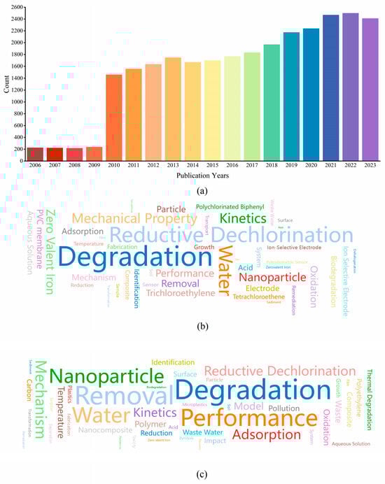 Literature search results for PVC dechlorination: (a) the literature count retrieved from the Web of Science literature database between 2006 and 2023; (b,c) keyword frequency cloud map for PVC dechlorination on Web of Science in 2013 and 2023, respectively.