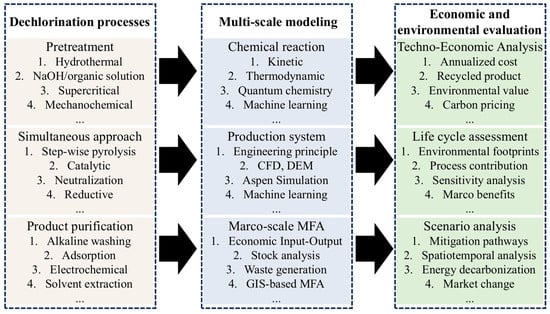 For technologies that have not yet been applied industrially, conducting LCA and TEA can be challenging due to the lack of available data. This data scarcity makes it necessary to estimate the input–output data of production systems using physical, chemical, and engineering principles. To this end, robust process modeling is crucial for evaluating dechlorination processes. By thoroughly analyzing literature related to multi-scale models, we can better understand the influence mechanisms of various variables in the recycling process of PVC waste. Mathematical models, as key analytical tools, allow for the prediction and optimization of reaction behaviors under different process designs and operating conditions. This approach, ultimately, reasonably quantifies the energy consumption, material input and product yield for realizing the assessment of economic viability and environmental footprints.