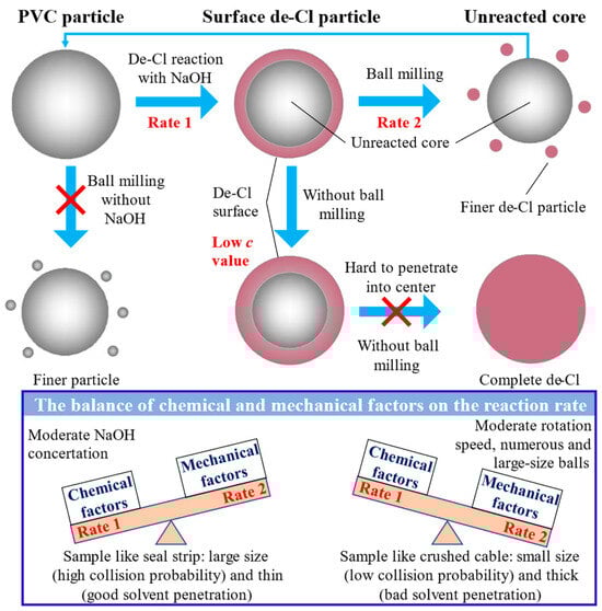 Dechlorination mechanism of PVC particles in the presence and absence of NaOH and ball milling, and effect of chemical and mechanical factors on the reaction rate. (Reprinted with permission from Lu et al. [25] Copyright 2019 Elsevier).