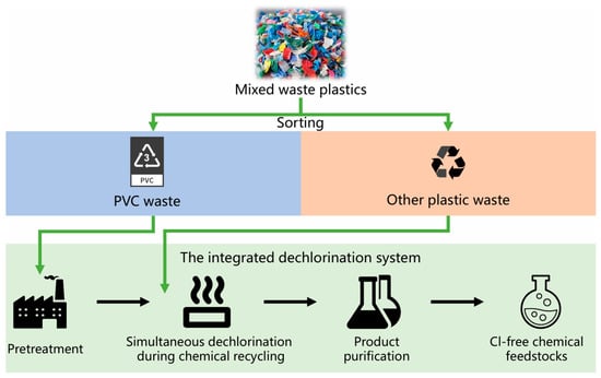 For simultaneous dechlorination during chemical recycling, this section summarizes pyrolysis, catalytic dechlorination, and electrolytic dechlorination techniques. Comparative analysis shows that the principles and reaction processes of simultaneous dechlorination during chemical recycling are similar to those of pretreatment, such as pyrolysis and catalytic dechlorination. However, simultaneous dechlorination during chemical recycling achieves further dechlorination based on pretreatment, meaning that pretreatment is a prerequisite for simultaneous dechlorination during chemical recycling. In addition, as an emerging dechlorination technology, electrolysis removes chlorine from PVC waste through electrochemical reactions. Compared to traditional simultaneous dechlorination during chemical recycling (e.g., pyrolysis and catalytic dechlorination), the advantage of electrolytic dechlorination lies in its ability to remove most of the chlorine in a short time, with high dechlorination efficiency.