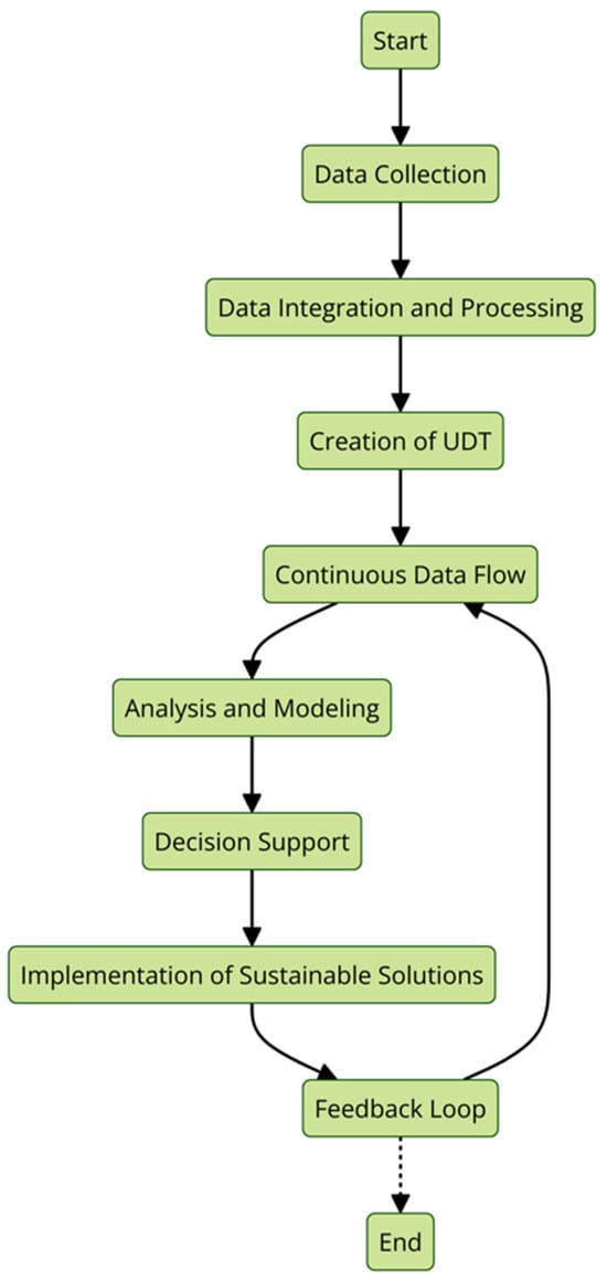 In the digital age, UDTs have positioned themselves as a critical metaphor within sustainable smart cities, likened to concepts such as ‘city brain’ and ‘platform urbanism’ [5]. It highlights UDTs’ advanced modeling and simulation capabilities in developing innovative solutions for environmental sustainability [1]. This shift towards a UDT-empowered approach in urban management and planning represents a broader ambition to redefine smart cities as sustainable ecosystems [6]. These ecosystems aim to leverage Information and Communications Technology (ICT) and other innovative tools to improve urban life and operational efficiency and safeguard future generations’ well-being in line with sustainability goals [7].