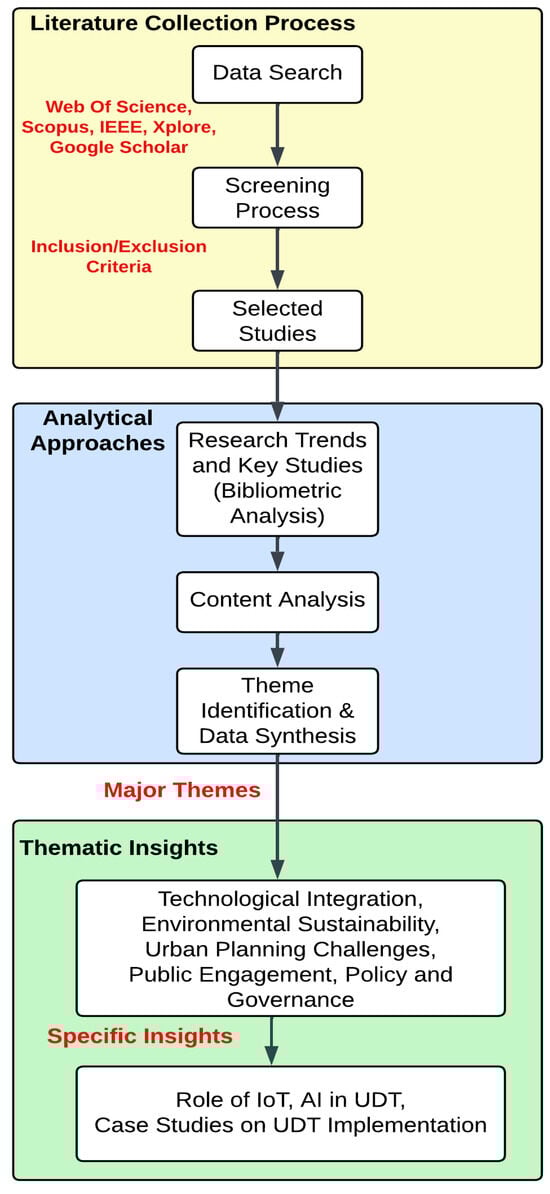 To construct a comprehensive foundation for these questions, an extensive literature review search was conducted across several academic databases, including Web of Science, Scopus, IEEE Xplore, and Google Scholar (Figure 2). The search strategy employed a combination of keywords and phrases to capture the breadth of UDT research.