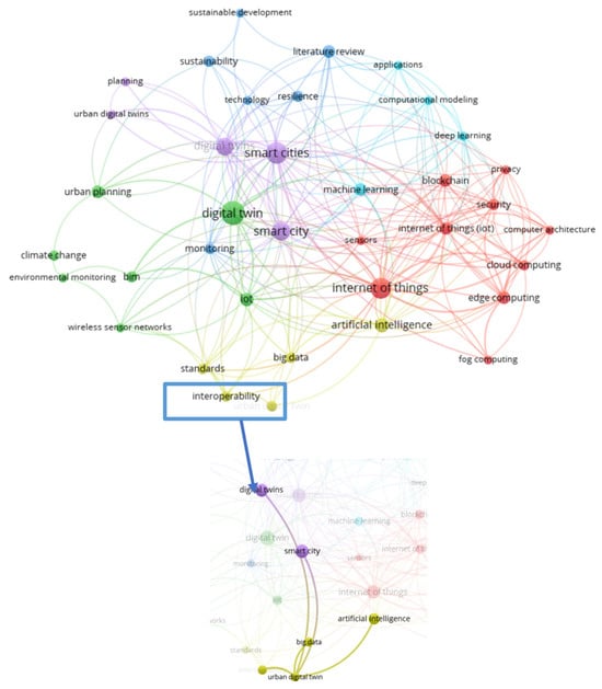 The intricate web of terms presented in the visual network captures the interconnected nature of current research themes. Lines weaving through the diagram represent thematic ties between various concepts, signifying the extent to which areas such as ‘smart cities’, ‘internet of things’, and ‘artificial intelligence’ overlap and influence each other using VOSViewer [17] based on the documents chosen to review (Figure 5). The color coding of these lines denotes different clusters of interconnected topics, suggesting areas of research that are frequently explored in tandem, such as ‘digital twin’ and ‘IoT’, which may be seen within the same color spectrum.