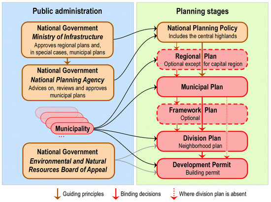 While municipal land use planning is mandatory, only the most populous municipalities run their own planning departments. Rural municipalities hire consultants to prepare the plans. Municipal planning is overseen by the NPA, which provides guidelines for local governments and their consultants [32]. As part of that, NPA issues lists of national policies it recommends municipalities to consider in their planning. The list is not updated every year, but the one used in this study dates from 2014 and includes policies on climate, sustainability, tourism, culture, marine issues, and more [34]. The 20 national policies included in the study are those addressing sustainability, rural development, and land use (Table A1). The planning process requires public participation, and the NPA and other national institutes are consulted as well. After the local government approves the plan, it is sent to the NPA for final evaluation and approval and subsequently receives a binding status.