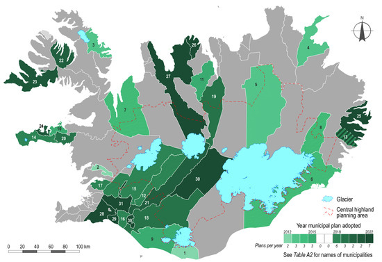 This study reviewed the content of Icelandic national policies and rural municipal plans regarding sustainable agri-food production and rural development. All municipal plans, and the national policy documents, are prepared in Icelandic. However, some of the latter have been translated to English. The study spans the period from 2012 through 2022. National policies (20 documents) relevant to land use planning, as well as agricultural subsidy contracts (seven documents) for the period, were coded and analyzed (Table A1), as were all municipal plans for rural municipalities that were approved during the study period (31 plans, Figure 2, and Table A2). The study analyzed how sustainable rural development and agri-food production had been addressed in the documents, as well as the conformity between national polices and municipal plans.