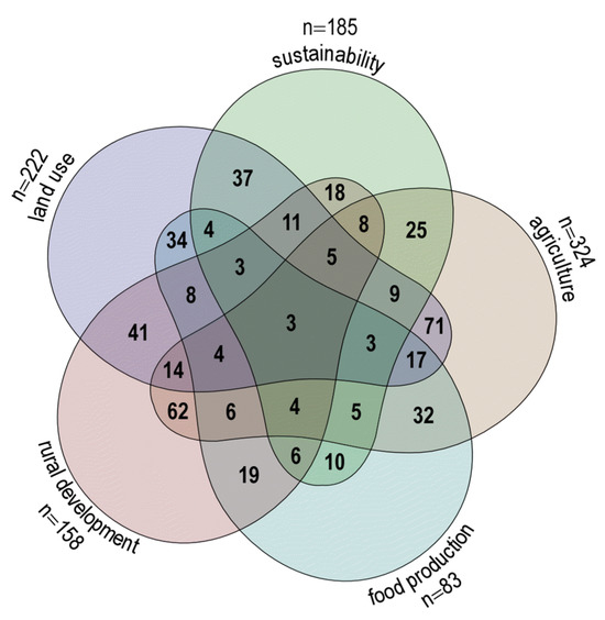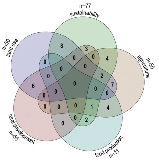 The aim of the analysis of core code categories was to determine how many of them were addressed in close proximity or derived from one quotation. This analysis indicates how strongly the core categories are linked in the text. When the core categories were compared, the result showed very few instances of proximity. The most frequent were those of sustainability and land use, and agriculture and land use (Figure 3). On the other hand, food production was never mentioned in proximity with either land use or rural development (Figure 3).