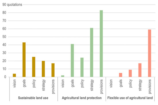 Figure 5 shows three selected code categories and the frequency of their quotation within the policy elements. Sustainable land use was the category most frequently used as the goal in the plans, but agricultural land protection was a common goal as well. Moreover, the latter was the category that had the strongest likelihood of being implemented, as agricultural land protection was frequently mentioned in relation to actions or provisions. Flexible use of agricultural land, where nonagricultural development was allowed for without changing the delineated land use, was also coded and analyzed regarding the policy elements. As could be expected, no municipality declared flexible use of agricultural land as its vision, but this evolved through the different policy elements, and eighteen municipalities allowed for flexibility in agricultural land provisions in a total of 59 quotations. An example was where residential development for up to five homes on agricultural land was allowed, or where nonagricultural development such as light industry was allowed on agricultural land without changing the delineated land use [67,68]. An example could also be found where the policy was to protect agricultural land. Yet, when it came to provision for agricultural land, division of farms into up to five 20 ha units, including a residential home on each one, was allowed [69].