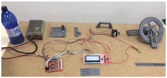 The electrical and electronic components of the prototype (Figure 3) include a 240 W power supply with a voltage output of 12 V and a rated current of 20 A, connected to a motherboard model Anet3d v1.7 or similar. Several key components are connected to this control board: an LCD display with built-in analogue controller model 2004/12864, a 48 mm 1.68 A stepper motor from manufacturer Moons’ Industries located in Shanghai, China and a 12 V–40 W heater block with an operating temperature range of 40~+260 °C, incorporating a temperature sensor and a 1.75 mm diameter hole nozzle for rPET filament output. In addition, a 12 V fan is incorporated at the outlet of the heater block to create an airflow to cool and solidify the rPET filament. All of these electrical and electronic components were salvaged and reused from a 3D printer that was not working at the school. If a 3D printer is not available to obtain the components, they can be purchased at a relatively low cost.