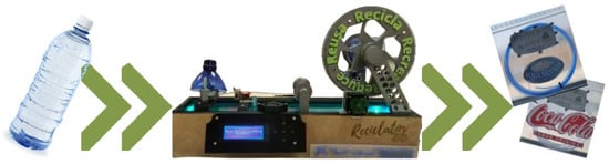 The contemporary era is characterized by consumerism, which has resulted in the generation of considerable quantities of waste, particularly in the form of plastic materials such as PET bottles. The objective of our research is to design and fabricate a prototype for the conversion of PET bottles into a new raw material, namely filament for 3D printing. As other researchers have done [,], our aim is to reduce the environmental impact and identify ways of reusing materials for 3D printing by reintroducing discarded PET plastic bottles back into the production and consumption chain.