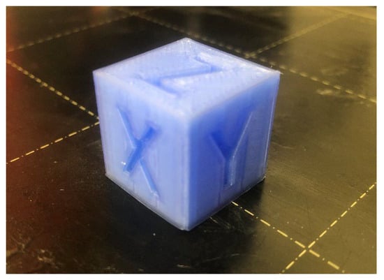 Calibration cubes were produced using rPET filament, with a series of experimental tests conducted to calibrate the temperature and print speed parameters of the designs. The tests yielded satisfactory results at temperatures of up to 230 °C, a hot bed temperature of 80 °C, and a print speed of 35 mm/s. The printing process is illustrated in the accompanying figure (Figure 6). The material exhibits high hardness following the printing process, with a surface finish that is glossy.