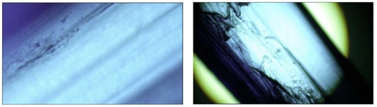At the structural level, the two types of filaments were examined under a microscope (Figure 7). It was observed that both filaments exhibited transparency. However, there was a significant discrepancy in the internal structure of the PETG filament, which was uniform, in comparison to that of the rPET filament, which was irregular. The aforementioned heterogeneities in the internal structure had a negligible impact on the printing process, as the external structure was smooth and homogeneous, allowing the filament to be extruded in the 3D printer. It seems plausible to suggest that these internal structural irregularities are the result of a void space created during the rPET processing stage. This discrepancy could be rectified by incorporating a filament flow control mechanism into the prototype, thereby achieving enhanced uniformity at the nozzle outlet of the heating block.