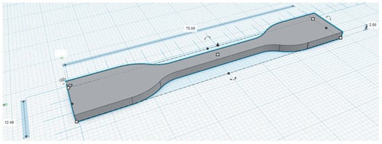Subsequently, a series of tests were conducted to determine the tensile strength of materials commonly employed in 3D printing, including our rPET filament. The tests were conducted using a high-precision column machine that was specifically designed for the testing of materials with a load of less than 10 kN. A specimen model was designed in accordance with ISO 527-1:2020 [] (Figure 8) for the purpose of the test. Subsequently, the aforementioned design was employed for the 3D printing of specimens representing each of the filaments under investigation: PLA, ABS, PETG, and rPET (Figure 9). The tensile strength of each specimen was determined through testing using a specialized machine, the results of which are presented in Table 2.