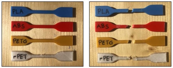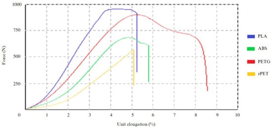 Figure 10 illustrates that the PLA, ABS, PETG, and rPET specimens exhibited brittle failure. The PETG sample demonstrated the highest breaking limit, followed by ABS, PLA, and rPET. These results align with the characteristics of these types of plastics. The observed reduction in the tensile strength of the rPET filament can be attributed to the presence of internal structural failures and the formation of air bubbles during the filament production process, which have a detrimental impact on its structural integrity.