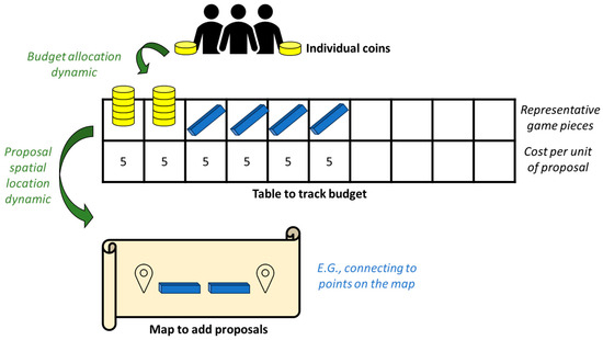 This paper proposes a versatile method based on analog game design that can also be transferred to digital and hybrid platforms (MIQUAPA). Our method aims to deliver participatory and collaborative decision-making planning processes that can mimic or support participatory budget allocation processes, enhancing engagement in PB through game-based approaches. From a game design perspective, our method departs from modern board game design elements [11] like voting, tracking, and tile placement mechanisms [12]. It can be combined with maps representing the spatial planning issue [13,14]. We argue that this method is suited to participatory budget allocation processes and defines priorities and a hierarchy of choices. In addition to this, it includes co-design dimensions, allowing users to define some game elements. The use of physical board game components makes it tangible for newcomers. The low-tech and low-cost approach is easy to prototype from a functional and economical perspective [15], simplifying what can be achieved even more by using low-cost digital technologies for the same purposes [16].