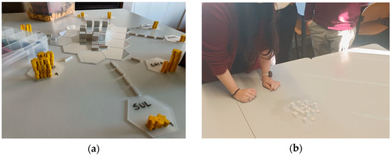 Modeling the game during playtesting, considering the possible modeling of the campus and the connections to travel origins/quantities (a); players modeling the FEUP campus inside the hexagons (b).
