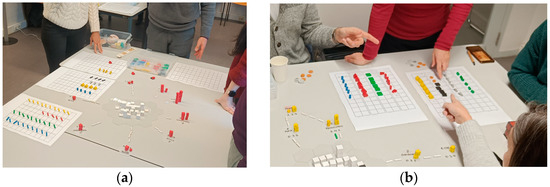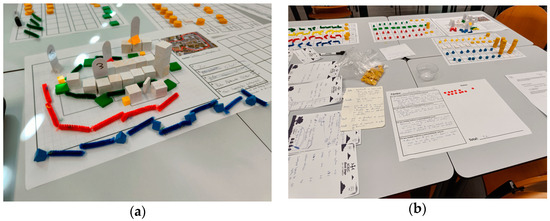 In S4, the participants spent the budget received each turn (income), replacing it with the piece representing the proposal unit (Figure 1 and Figure 7a). Then, the piece was placed on the map to identify the intervention (proposal) location on the model (Figure 7a).