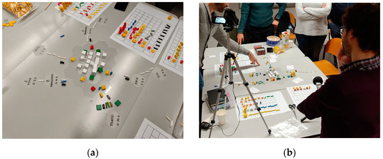 Participants choosing the pieces (the quantity and what they represent) and placing them on the tables (a); participants allocating budget to define the costs of the pieces (solutions) (b).