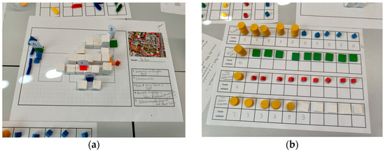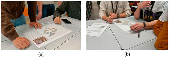 In S1, the participants modeled the spatial representation of the FEUP campus, detailing the urban surroundings. The campus was represented by an orthogonal grid map extracted from a satellite image. The participants had a limited amount of white wood pieces (20 cubes and 5 slabs) to represent the buildings, green spaces, parking, and other infrastructure existing on the campus. S1 resulted from the participants’ agency, allowing them to place the wood pieces over the grid map in a creative and co-design process (Figure 5a,b).