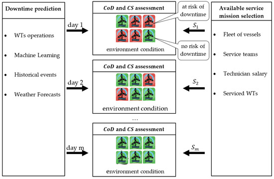 The search for such a balance is made possible by the modeling framework, the concept of which is presented in Figure 1. The annual service mission requires the scheduling of available service teams for each WT and vessel transport between the WTs according to their availability. For only small OWFs can such a service mission, , be carried out within a single day, so it is assumed that the mission will consist of multiple one-day sub-missions, , performed over the considered service period such that , where denotes the number of required submissions. As part of each of the sub-missions, service for a set of WTs must be carried out. By the implementation of predictive downtime information, such mission will be altered in the following ways: