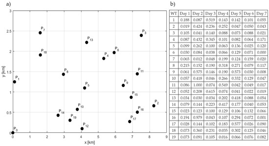 In the problem of planning service missions, it is assumed that they are decomposed into sub-missions: , constituting the mission plan for the subsequent days of the period : On every -th day, a subset of turbines are serviced. WTs are selected according to the principle: “WTs with the highest downtime probability first”. The adopted principle means that the subset consists of the turbines with the highest probability of downtime (where determines the number of turbines serviced on a given day). An example table with predicted probabilities of WT downtimes is presented in Figure 2b. For planning a mission, the following assumptions are applicable: