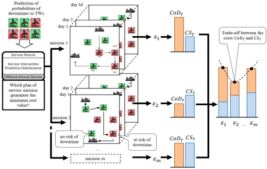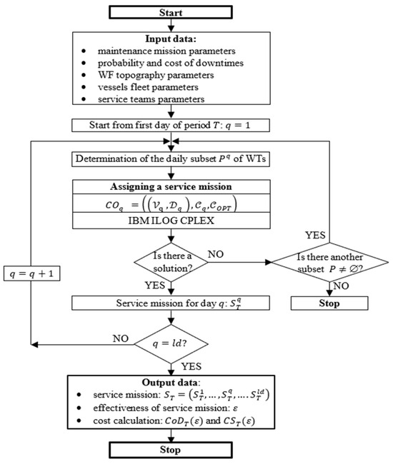 The answer to this question requires an assessment of the assigned missions in terms of the cost of downtimes and cost of service . These costs are determined using a method implementing problem (24) and aimed at proactive OWF maintenance planning (Figure 4). The required model input concerns the type of mission adopted (,), predicted risk of downtime (), OWF coordinates (), fleet parameters (, and others), and service team parameters (, ). For a given day, , the first stage of the method consists of the selection of a subset of WTs to be serviced. This selection is made using a simple greedy selection of WT with the highest probability of downtime events. There are alternative strategies for such selection of WTs that would probably be more effective than greedy selection, but this strategy is used to simplify the complexity of the process and to keep the focus on the efficiency of the service. The next stage consists of determining the service mission schedule with the lowest total service time . For this purpose, the constraint programming driven problem (24) is formulated and implemented in a declarative programming environment (e.g., IBM ILOG CPLEX). Its admissible solutions , which includes the routes of the vessel fleet and service team service schedule, form the total service mission: .