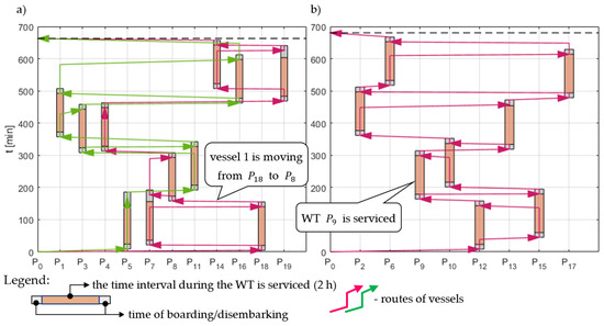 In other words, solving problem is equivalent to assigning the least time-consuming maintenance mission for a given subset of WTs. The solution to the problem determines service missions for each day of period . The adopted representation makes it possible to reduce the considered problem to the following question: Which routes () and schedules of vessels () of each -th day (of the period ) results in effectiveness guaranteeing the minimum cost value: ?