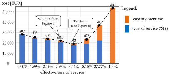 Depending on all the possible configurations of available service resources and the applied service strategies, this will result in multiple different service mission plans. These service plans will additionally result in different costs of downtime, , and costs of service, , see Figure 3. It is to be expected that any reduction of will require an increase in as the service complexity increases while reducing to zero will rarely be possible at all due to service resource restrictions.