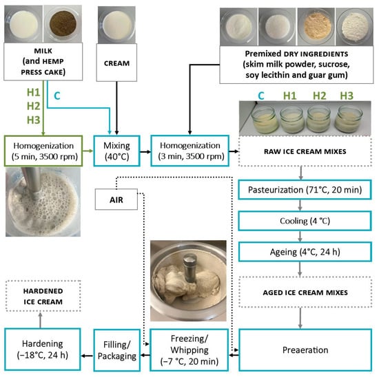 Ice cream samples with the addition of hemp cake press flour, as well as control ice cream, were prepared as explained by Goff [], with slight modifications (Figure 1). All ingredients were weighted separately according to the formulations reported in Table 1.
