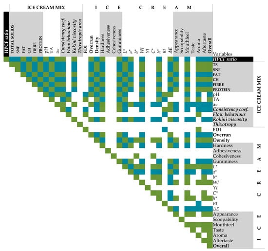 Pearson’s correlation matrix. Coloured boxes indicate a significant correlation (p < 0.05); green boxes signify the positive and blue the negative correlations.