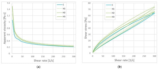 Flow behaviour of ice cream mixes: (a) apparent viscosity (Pa s) and (b) flow curves (shear stress in Pa at different shear rates in 1/s) of ice cream samples. C—control ice cream; H1, H2, and H3—ice cream with 25.0%, 37.5% and 50.0%, respectively, skim milk powder replaced by hemp press cake flour.