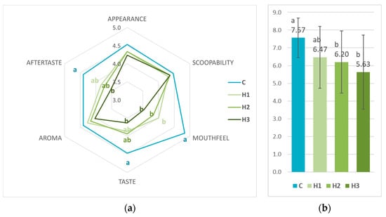The overall acceptability of the ice cream was assessed by a hedonic scale of 9 points, ranging from 1 (dislike extremely) to 9 (like extremely) []. Furthermore, acceptance of sensory properties, including appearance, scoopability, mouthfeel, taste, aroma and aftertaste was assessed using a 5-point hedonic scale, ranging from 1 (dislike very much) to 5 (like very much). A group of 30 semi-trained assessors (24 women and 6 men), including both students and academic personnel from the Faculty of Food Technology Osijek, Josip Juraj Strossmayer University of Osijek, Croatia, participated in the sensory evaluation. Participants were chosen based on their frequent consumption of ice cream and the absence of any known allergic reactions to hemp press cake and the standard ingredients of dairy ice cream.