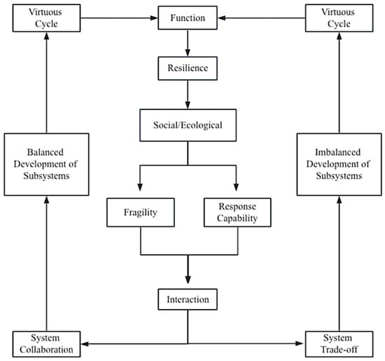 As one of the most important ways to implement sustainable development, resilience has become a familiar and highly valued focus of many environmental disciplines, including ecology, environmental hazards, and climate change [34]. Ecologist Holling (1973) initially proposed the resilience theory and first defined what ecological resilience means, arguing that the expressive behavior of ecosystems can be determined by two attributes, resilience and stability, and applying it to explain how forests and other ecosystems can persist over time despite being threatened [35]. In the 1980s, Pimm put forward a different idea: resilience is the rate at which a system can return to its original equilibrium state after being subjected to a perturbation [36]. The common point is that both are concerned with the maintenance of the structure and function of the system. Still, the difference is that Holling emphasizes the amount of perturbation the system can withstand, i.e., stability. In contrast, Pimm, based on the equilibrium state, is concerned with the combined ability of the system to recover, resist, persist, and change after being perturbed. Later, Holling (1996) further proposed Engineering Resilience, in which the definition of resilience is based on the assumption of a single stable state and the assumption that the system has only one “optimal” equilibrium state. When the system appears to be in other unstable states [37], measures should be taken to restore the system to its optimal state. In this definition, resilience is based on the assumption of a single stable state, that the system has only one “optimal” equilibrium state, and that measures should be taken to return the system to equilibrium when other unstable states occur. The difference between these two approaches stems from their different perspectives on system stability, which have a certain degree of validity and applicability. Figure 1 gives a clear picture of the theoretical framework of the socio-ecological system resilience.