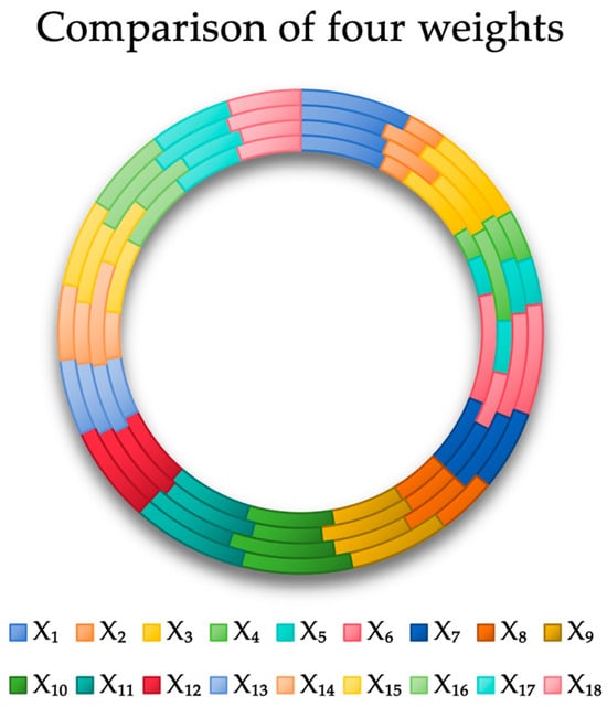 Figure 2 shows the different weights calculated by the four methods, from which we can clearly see the difference in each metric under different algorithms. The weights in the innermost circle represent the entropy weighting method weights, followed in order by the CRITIC method weights, the coefficient of variation method weights, and the combined weights. It can be clearly seen that the combined weighting method effectively circumvents the differences in weights under different methods.