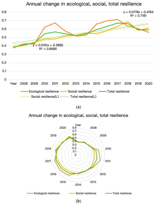 Annual change in ecological resilience, social resilience, total resilience. (a) The line graph of the annual change in ecological resilience, social resilience, total resilience. (b) The radar graph of the annual change in ecological resilience, social resilience, total resilience.