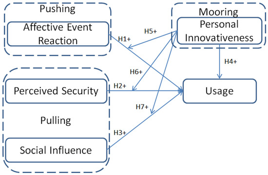 The affective event theory plays a key role in the research model by using the affective event reaction factor. Perceived security and social influence are workplace environment factors. Personal innovativeness is regarded as a kind of attitude factor. Behavior is a kind of usage factor. Push–pull–mooring theory gives a structure to this research, whereas affective event theory defines the factors of the research model.