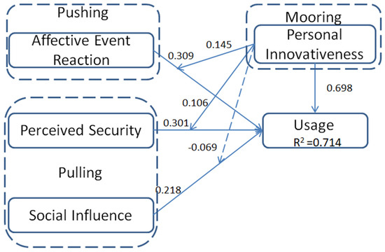 After the validity and reliability of the research model are supported, related empirical test results are shown in Figure 2. It gives that H1, H2, H3, H4, H5, H6 are all supported with p value less than 0.05. Unfortunately, H7 is not supported with a p value greater than 0.05 [65]. The path coefficient between personal innovativeness and usage is 0.698, which is the highest path coefficient of all. Affective event reaction positively affects usage with path coefficient 0.309. The path coefficient between perceived security and usage is 0.301. Social influence positively affects usage with path coefficient 0.218. Personal innovativeness positively moderates the relationship between affective event reaction and usage with path coefficient 0.145. Personal innovativeness positively moderates the relationship between perceived security and usage with path coefficient 0.106. Personal innovativeness does not moderate the relationship between social influence and usage. All the structural results are indicated in Figure 2. When couriers’ personal innovativeness is high, both affective event reaction and perceived security are associated with a higher level of usage, whereas social influence makes no difference. R-squared is the coefficient of determination. It reflects the proportion of the total variance of the dependent variable that can be explained by the independent variable through the regression relationship. The R-squared value in this model is 0.714, which means that the regression relationship can explain 71.4% of the variance of the dependent variable.