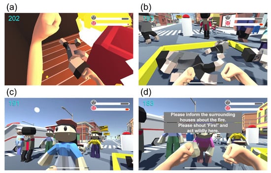 Screen shots of the “Evacuation” stage: (a) carry out and save the injured or fallen people, (b) carry the injured or fallen people out of the house, (c) people outside the house who are confused, and (d) the player asks them to call for help.
