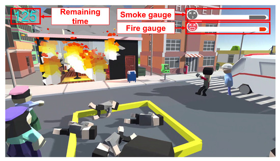 To enhance realism, the game was designed as an action game that allows players to move freely in a three-dimensional (3D) space. Collines showed that a distinguishing feature of video games is their interactivity, and that sound plays an important role [26]. According to this, music was created to evoke a sense of urgency and heighten the tension of the situation. To promote communication with others, a mechanism was implemented that allowed players to interact with other characters when they stopped. To further promote an understanding of the power of mutual help, we incorporated a system in which multiple options are displayed when a player speaks to others, and the score increases as the player gives correct instructions. This system is expected to help players understand the meaning of mutual help while realizing the importance of cooperation and effective communication with others. Gentile et al. demonstrated that games in which characters collaborate and support each other nonviolently can enhance both short- and long-term prosocial behaviors [27]. While this previous study does not specifically address mutual aid, based on this previous study, our game has the potential to promote communication for social support among players.