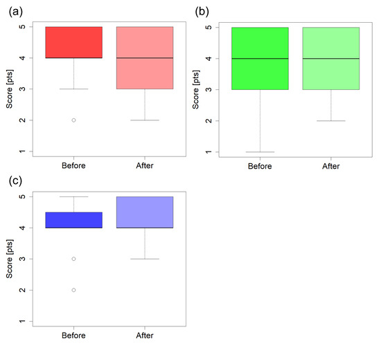 The questionnaire was used to examine whether the game had any effects. In this study, the same questions were asked before and after gameplay and compared to verify the game’s effects. Figure 5 shows the box and whisker plots for Q1, Q2, and Q3. Figure 5a–c show the results for Q1, Q2, and Q3, respectively.